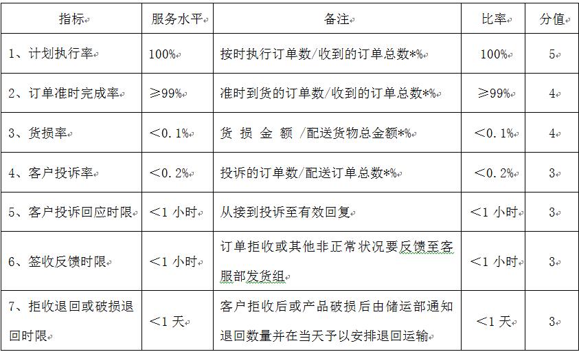 3.服務(wù)要求(1)遵循最安全,最合理的運輸方式和時限、提供最優(yōu)的價格。將貨物直接送達(dá)指定的收貨人。(2)對于當(dāng)天15:00前的出庫貨物,必須當(dāng)日取完,并在當(dāng)日根據(jù)實際發(fā)貨情況安排寄送。需提供每天物流單號。(3)貨物出現(xiàn)損壞、丟失等情況需要出具正式的書面說明,并按貨物丟失造成損失進(jìn)行賠付。(4)提供保質(zhì)保量和高效的服務(wù),包括節(jié)假日,配送投遞提供12小時服務(wù)。(5)責(zé)任感:業(yè)務(wù)員必須細(xì)心核對運輸貨物,如發(fā)現(xiàn)物件與實際貨物存在不符時,應(yīng)現(xiàn)場核對,減少錯誤率。(6)要求把貨物送到客戶手里后的運輸單據(jù)保存一年。(7)要求指派專人負(fù)責(zé)我方貨物運輸業(yè)務(wù)。(8)要求派人對我方打包好的貨件在我方現(xiàn)場進(jìn)行分單,以及搬運作業(yè),我方現(xiàn)場監(jiān)督。如發(fā)現(xiàn)重量、箱號與事實不符,需重新作業(yè),并處以每單50元的罰金。(9)國內(nèi)配送時限(門到門):根據(jù)所運輸貨物到達(dá)省份以最快速度送達(dá)。在規(guī)定的時間內(nèi)務(wù)必送達(dá),否則承擔(dān)客戶的投訴或賠償責(zé)任。(10)對于寄送的貨物客戶未簽收、包裝破損、重量不符的由中標(biāo)方承擔(dān)一切責(zé)任和后果。